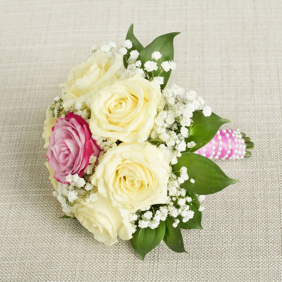 Our graceful bridesmaid bouquet is a stunning arrangement of Pinkish-purple Roses, White Creamy Roses, airy Gypsophila, and vibrant Aralia leaves. Designed with elegance and uniqueness in mind, this bouquet is the perfect accessory for your bridal party.